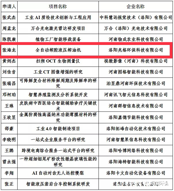 熱烈祝賀洛陽兆格環(huán)保科技有限公司全自動(dòng)榨腔液壓榨油機(jī)項(xiàng)目團(tuán)隊(duì)優(yōu)秀人才喜獲首屆河洛青年創(chuàng)新人才榮譽(yù)。