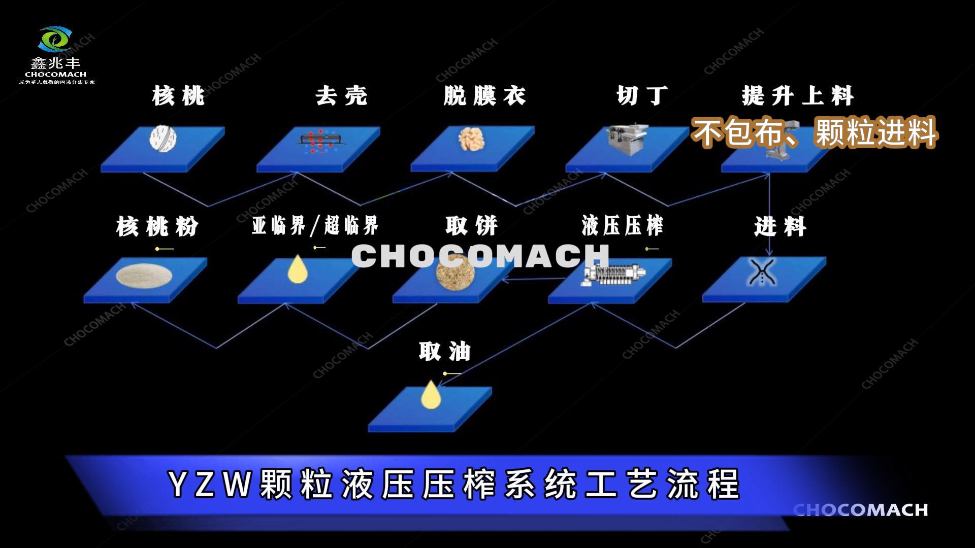 鑫兆豐YZW全自動(dòng)液壓榨油機(jī)--處理去衣核桃仁提油工藝流程