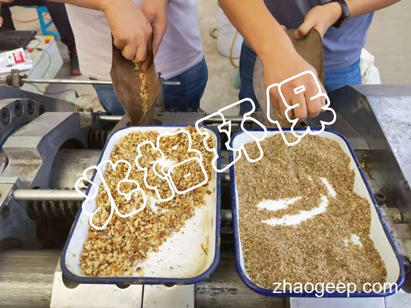 本次試驗(yàn)無(wú)論是從固體顆粒冷榨工藝層面,還是壓榨設(shè)備層面均取得了不小的進(jìn)步,取得很大進(jìn)展。試驗(yàn)結(jié)束后根據(jù)中糧工科檢測(cè)中心的檢測(cè)數(shù)據(jù),餅粕中核桃油含量(干基,%)在11.7%-18.8%之間,壓榨時(shí)間在40分鐘左右。