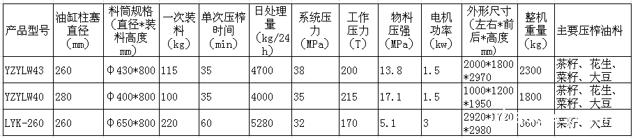 3、YZYL43型液壓榨油機配備預壓缸和推拉缸;YZYL40型液壓榨油機沒有配備預壓缸和推拉缸,都可以選配;LYK-260榨油機僅配備預壓缸,沒有配備推拉缸。