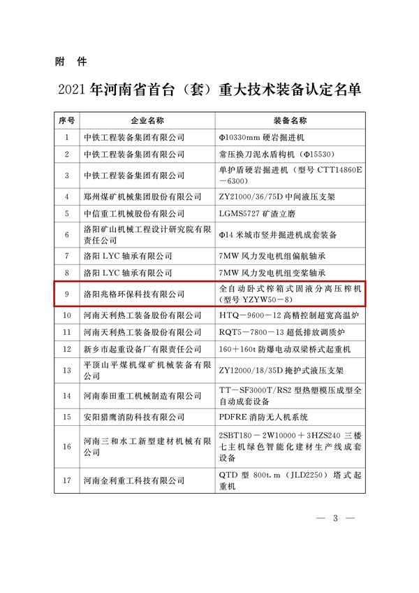 熱烈祝賀兆格環(huán)保自主研發(fā)的全自動臥式榨箱式固液分離壓榨機(型號YZYW50-8)榮獲“2021年河南省首臺(套)重大技術裝備”認定