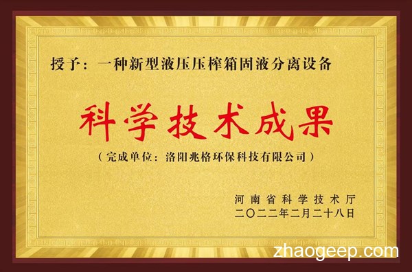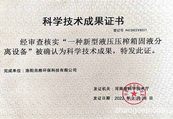 兆格環(huán)保自主研發(fā)的”一種新型液壓壓榨箱固液分離設(shè)備“榮獲河南省科學(xué)技術(shù)廳”科學(xué)技術(shù)成果“認(rèn)定。
